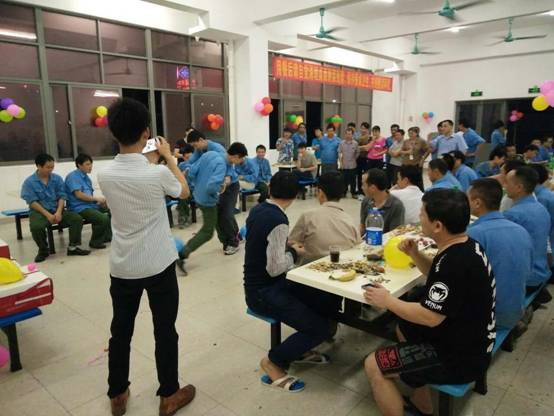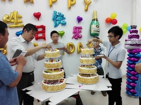 在员工享用美食与水果的同时,当晚现场进行了踩气球、夹传瓜子与纸杯传水三轮游戏,每个游戏都由寿星们自由组队参与。第一个游戏“踩气球”,两人三足需要高度的协调与配合,为了躲避对手突袭,寿星们上蹿下跳,左右摆动,动作滑稽,惹得全场哄堂大笑;第二个游戏“夹传瓜子”,大家争分夺秒往下一位队友手中输送瓜子,在输送的过程中如果瓜子不慎掉落只好重新开始,在围观人员的助威呐喊声中,寿星们加快步伐只为成功夹传更多的瓜子;最后一个游戏“纸杯传水”,要求选手们动作谨慎且快,配合度高,为把纸杯的水倒入队友的纸杯中时能够滴水不漏,大家的传输POSE千奇百怪,笑料百出,现场一片欢声笑语。