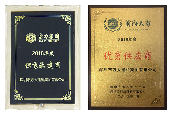 富力集团授予方大建科“2018年度优秀承建商”、前海人寿授予方大建科“2018年度优秀供应商”、 万科授予方大建科“最佳产品奖”、恒大海花岛给方大建科一封感谢信。年末获得的各大地产商授予的荣誉,涵盖产品质量、工程交期、客户服务等多个方面,是业主对方大建科在2018年经营管理及公司综合实力的充分认可。