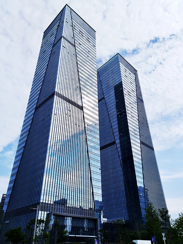 深圳·金利通金融中心位于深圳市宝安区,建筑高度211m,幕墙类型主要是单元式玻璃幕墙、石材幕墙、铝板幕墙。建筑外立面端庄大气,每个立面从底部至顶部斜向分布了400mm×390mm的铝板装饰柱,裙楼采用25mm厚花岗岩、铝合金挂件系统,面板错缝设计,搭配横向通长玻璃条窗及石材凹槽造型,整个立面显得错落有致。项目团队及时解决合作中碰到的问题,克服了工期紧、任务重、质量高等种种困难后,打造出一个集写字楼、城市公馆、裙楼商业为一体的“前海花园式集约化高端商务综合体”。